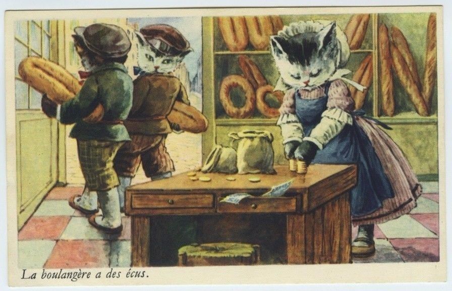 Title (ebay affiliate link): Cat Art Postcard~Dressed Cats in Bakery "The Baker Has Money"