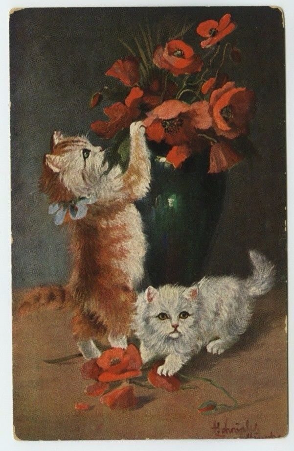 Title (ebay affiliate link): Cat Art Postcard~Kittens Playing by Vase Full of Poppies~Artist Signed c1911