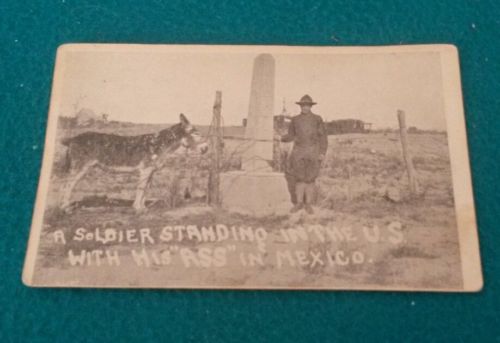 Title (ebay affiliate link): RPPC of soldier standing in the US with his "ASS" in Mexico. Military humor.