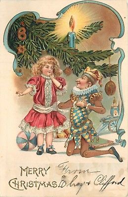 Christmas Toy Puppet Proposes to Doll Under Tree Embossed 1912 Postcard