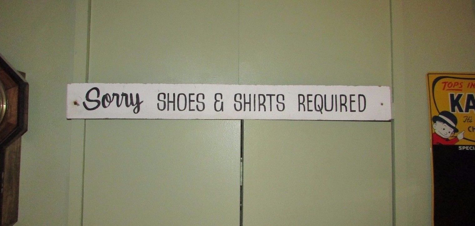 Title (ebay affiliate link): Vintage 1950''s Wooden Masonite SHOES & SHIRTS REQUIRED Drive Inn Business Sign