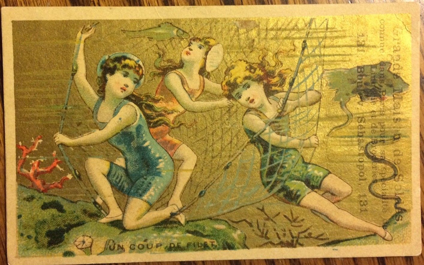 Title (ebay affiliate link): Victorian Trade Card DREYFUSS Bonneterie Girls Swimmers Caught in Net