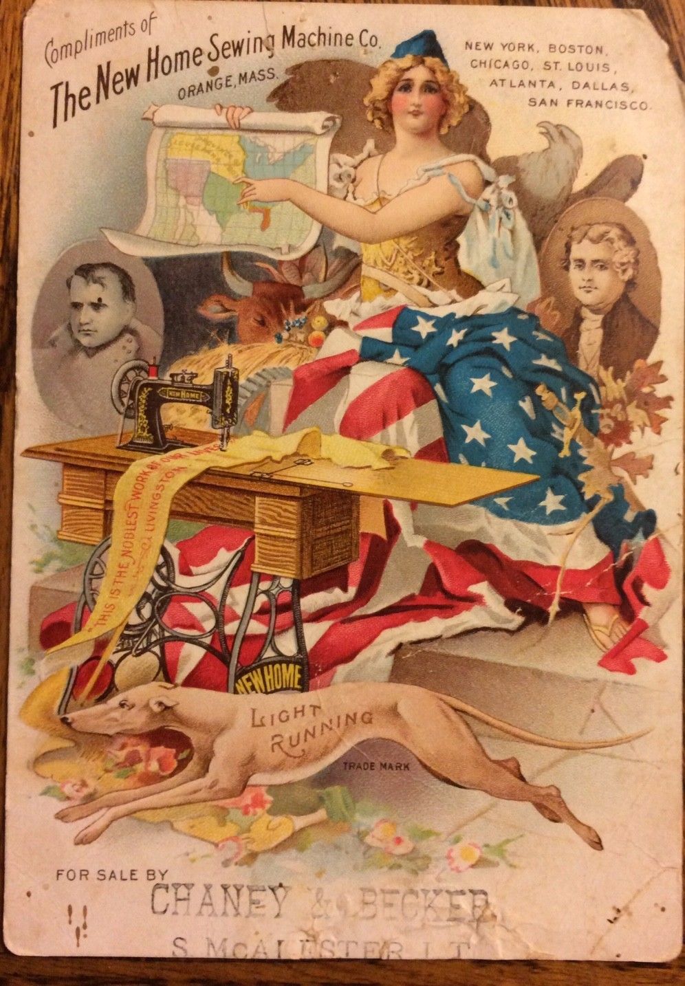 Victorian Trade Card NEW HOME SEWING MACHINE Lady Liberty Napoleon Jefferson