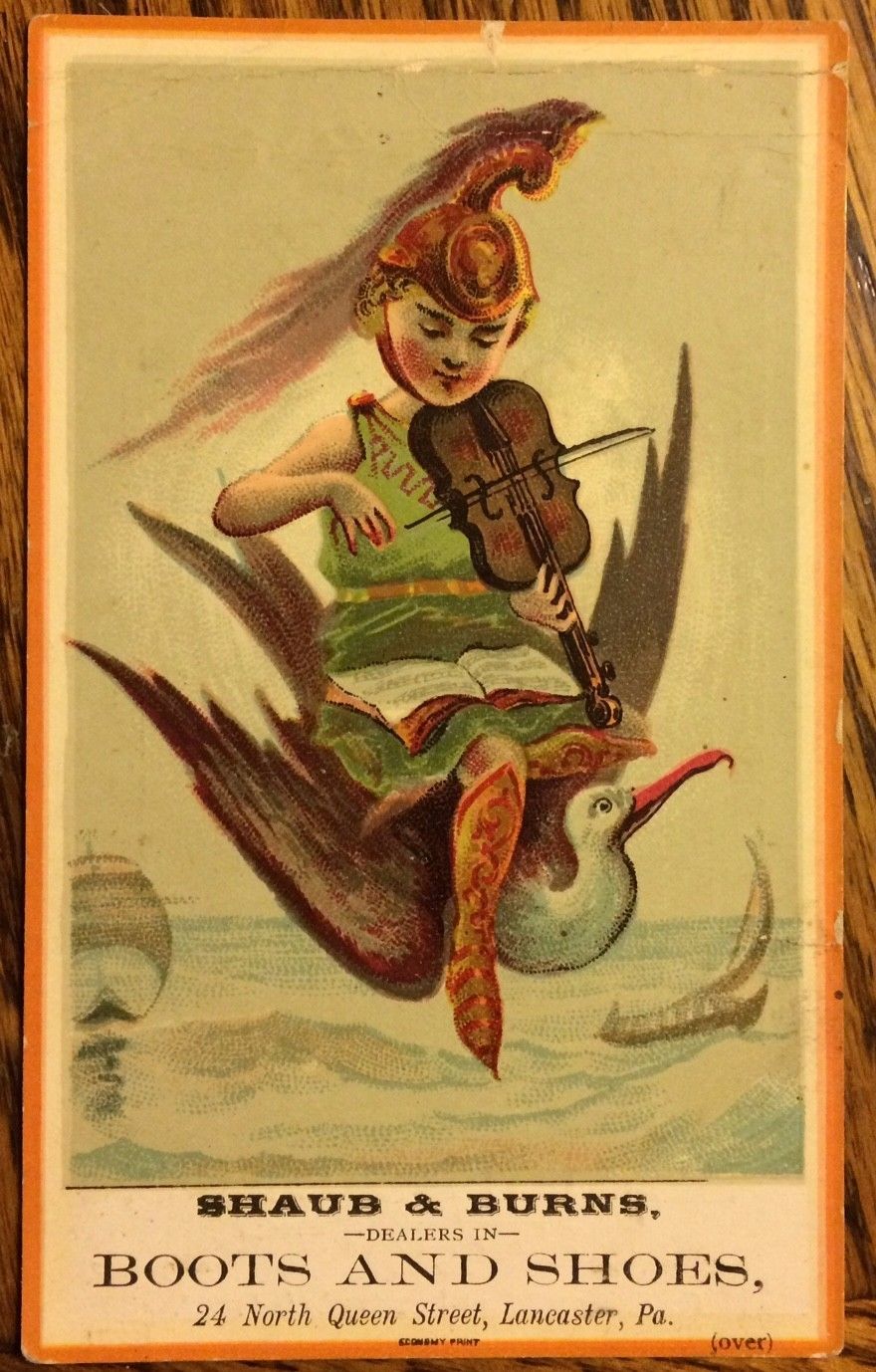 Title (ebay affiliate link): Victorian Trade Card SHAUB & BURNS BOOTS AND SHOES Violinist riding a Bird