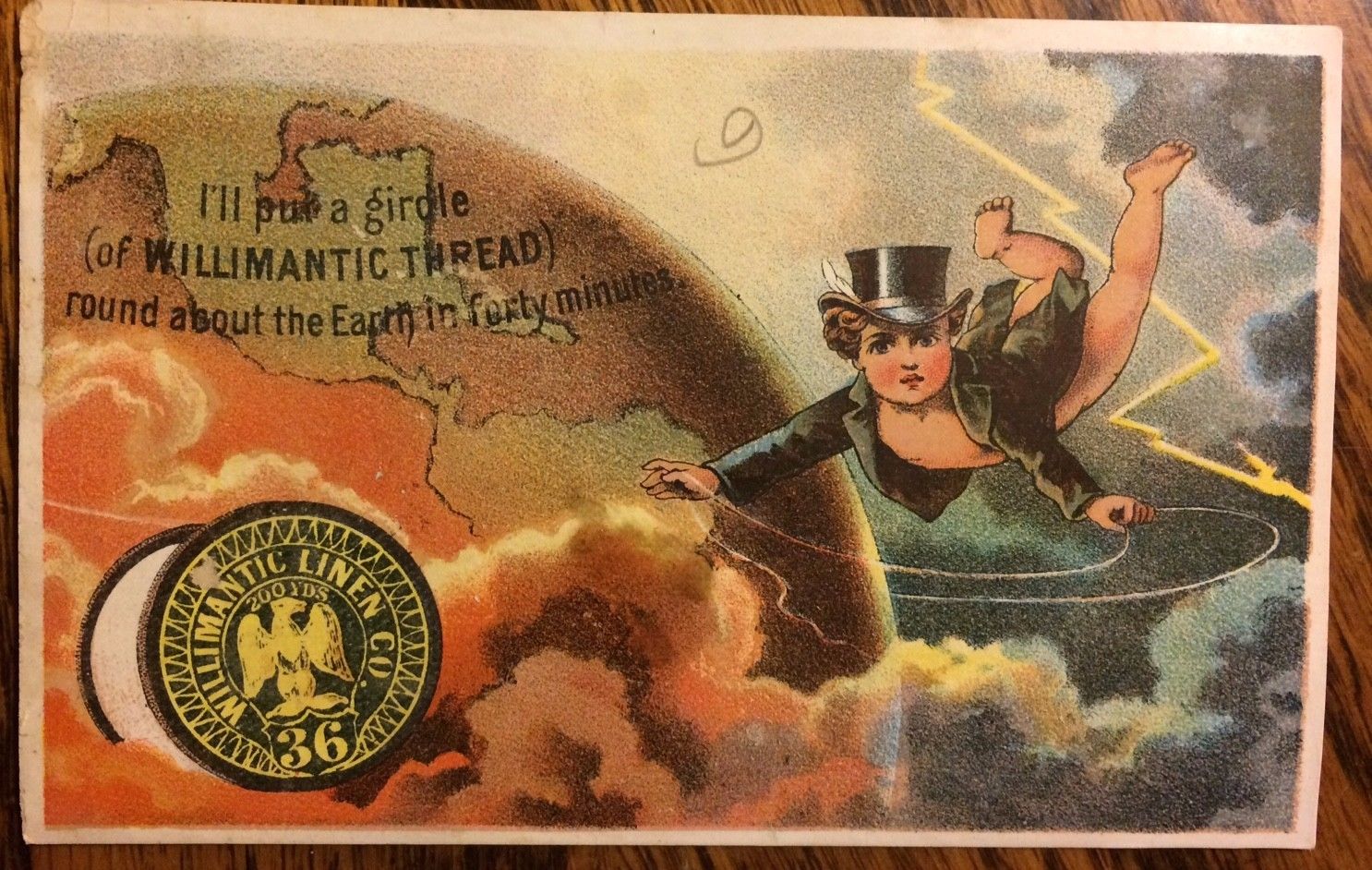 Victorian Trade Card WILLIMANTIC THREAD Girdle Around the Earth Cherub Top Hat