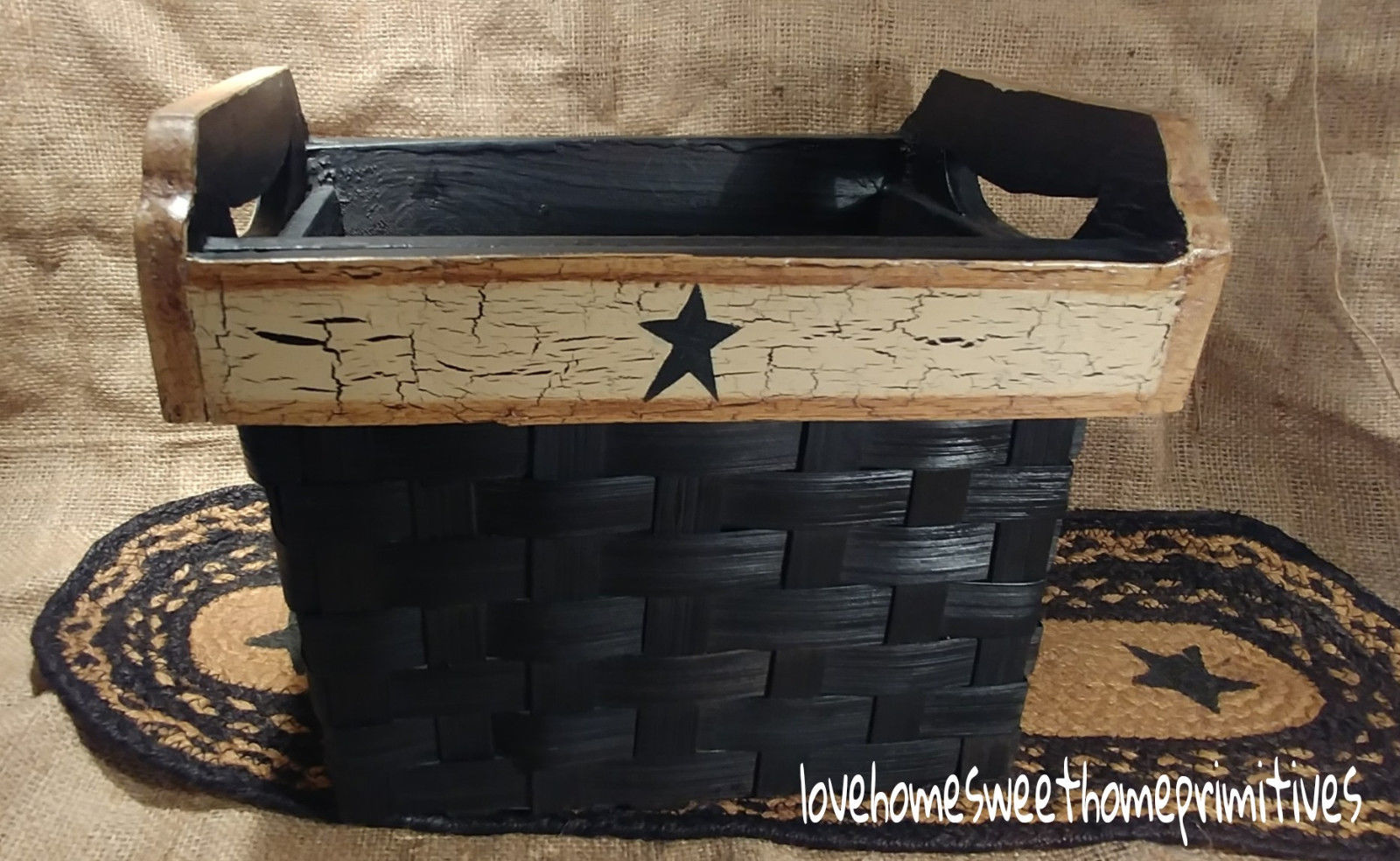 Title (ebay affiliate link): Primitive Crackle Tan & Black Stars Wood Basket Farmhouse Decor