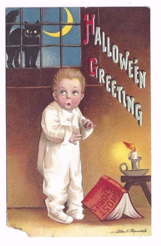 Title (ebay affiliate link): Antique db Halloween Clapsaddle Post Card Scared Little Boy Black Cat Moon
