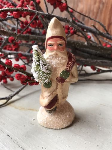 Title (ebay affiliate link): Black Forest Chalkware~ 3 1/2" Gold Folk Art Christmas Trudging Santa w/bag