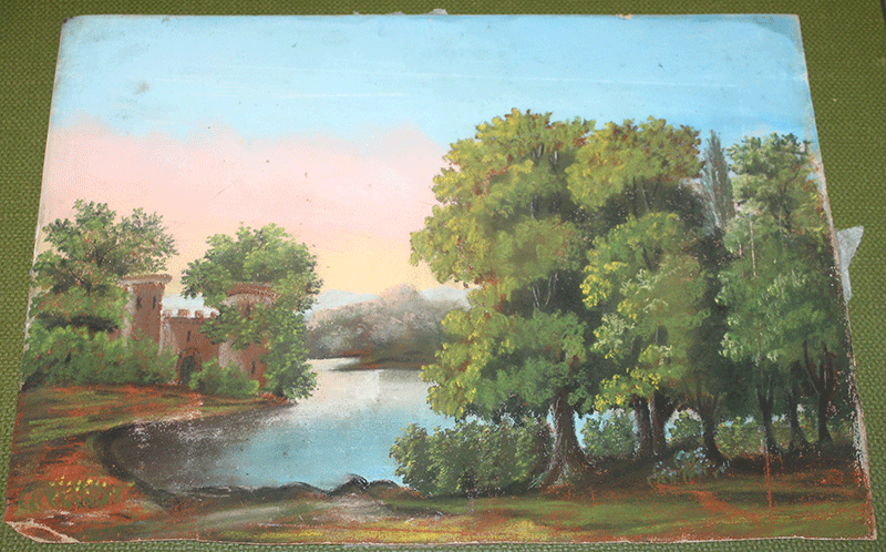 Title (ebay affiliate link): ANTIQUE Primitive PASTEL PAINTING Castle RIVER Beautiful!