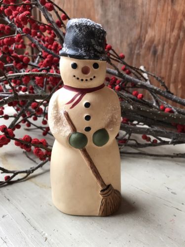Title (ebay affiliate link): Black Forest Chalkware~ 6" Icy Folk Art Winter Snowman w/scarf, mitts, & broom!