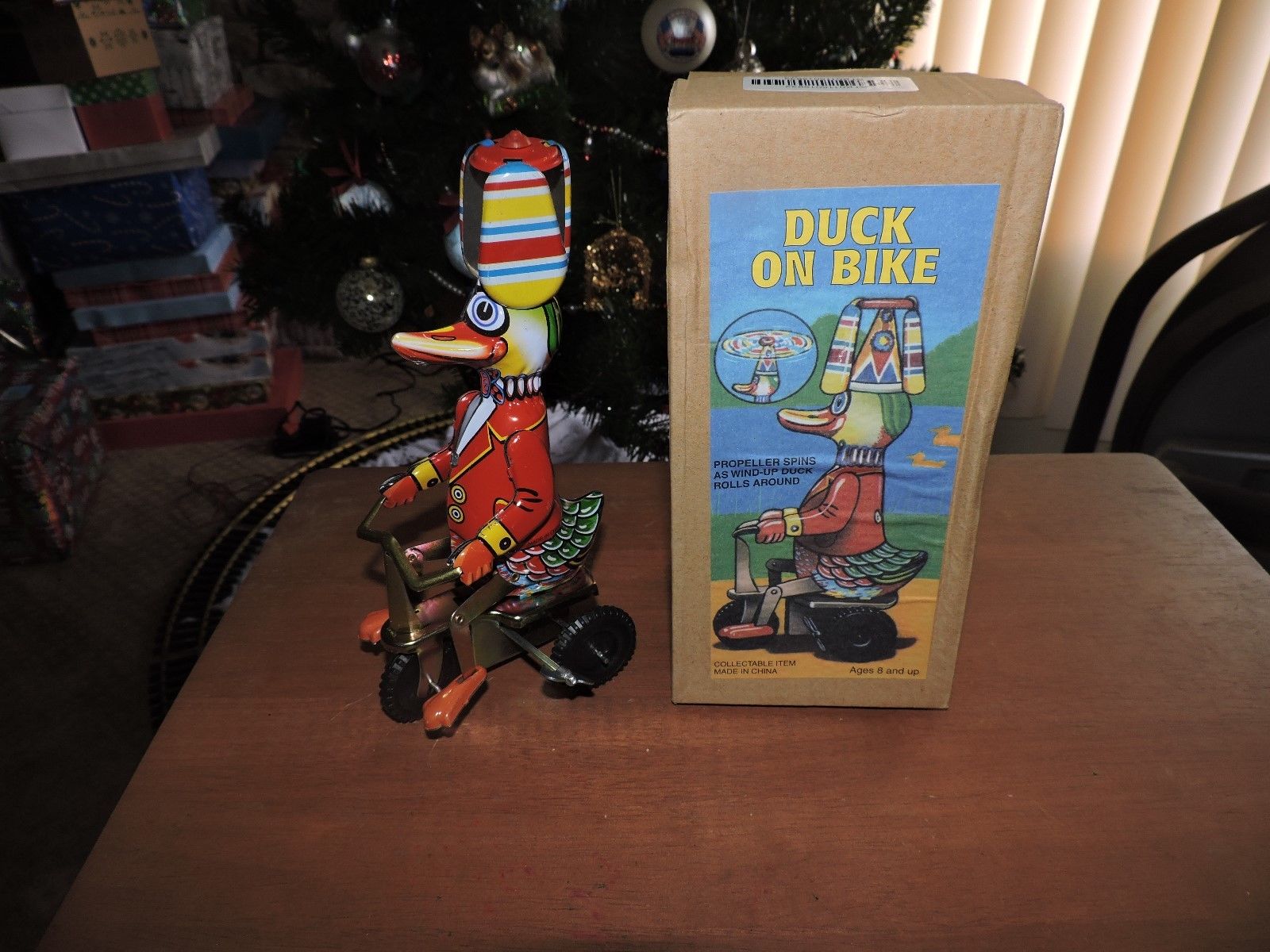 Title (ebay affiliate link): Schylling Duck on Bike Wind Up Rainbow Tin Toy Spinning Propeller Works Fine