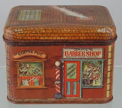 Vtg J Chein Tin Litho Box Canister / Barber & Fish Shop