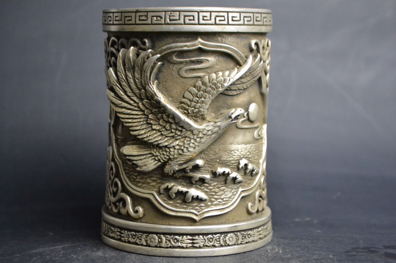 Collectible China Old Copper Silver Plate relief eagle fly dragon big brush pot