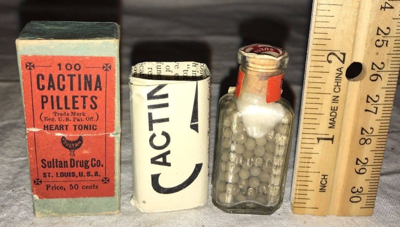 Title (ebay affiliate link): ANTIQUE CACTINA PILL HEART TONIC MEDICINE BOTTLE BOX SULTAN DRUG ST LOUIS MO OLD