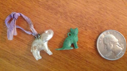 Title (ebay affiliate link): VINTAGE Metal CAT Charm Cracker Jack Toy Prize 1920''s-30''s, Plus Glass Elephant