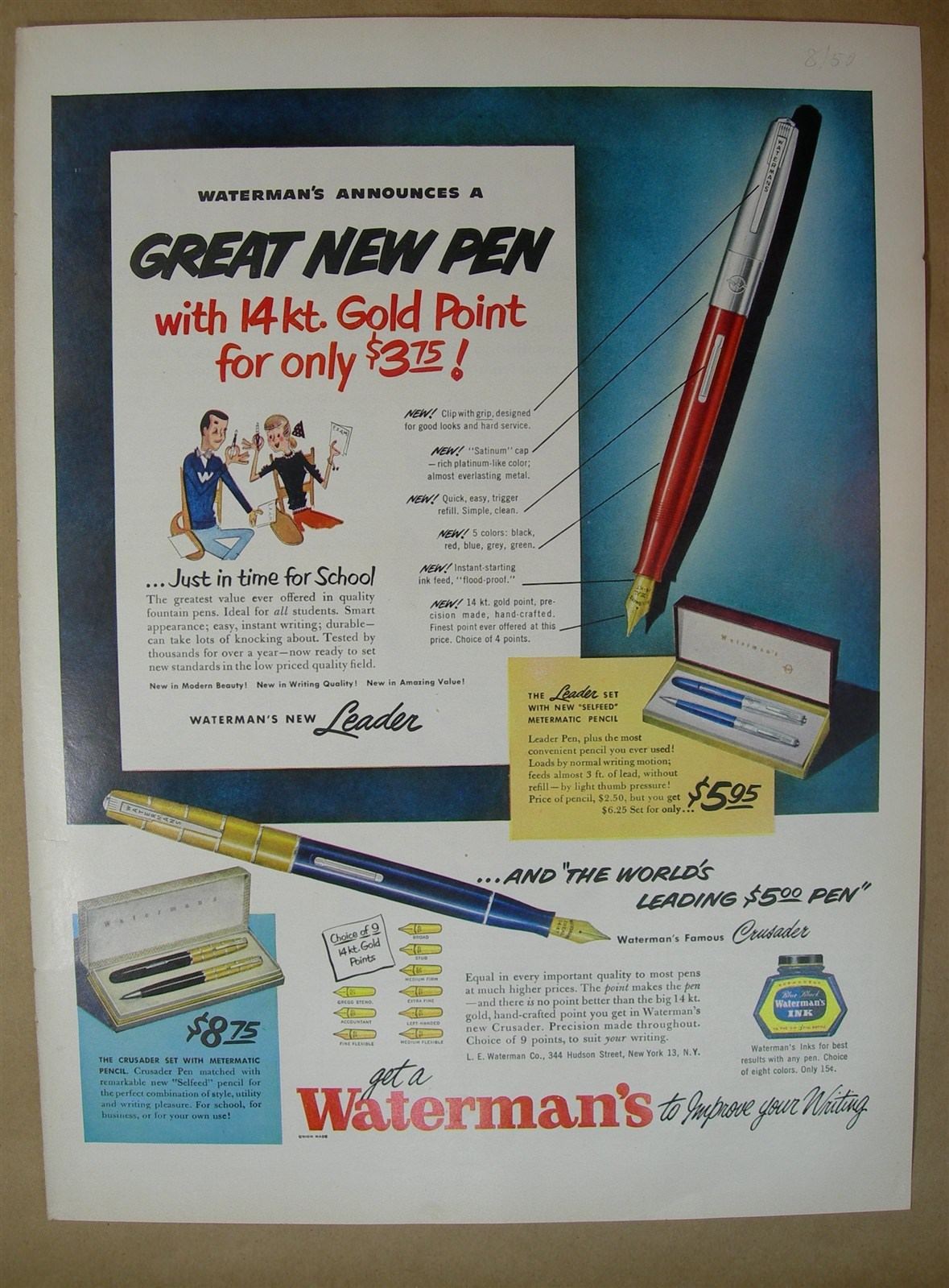 1950 Big ad- Waterman''s gold point pen-Oscar Mayer sack o'' sauce in can o'' meat