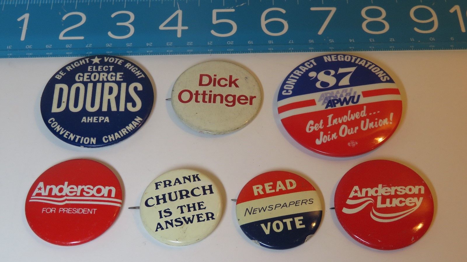 Title (ebay affiliate link): (7) Vintage Political Button Pin- DOURIS, ''87 APWU CONTRACT, READ/VOTE, CHURCH +