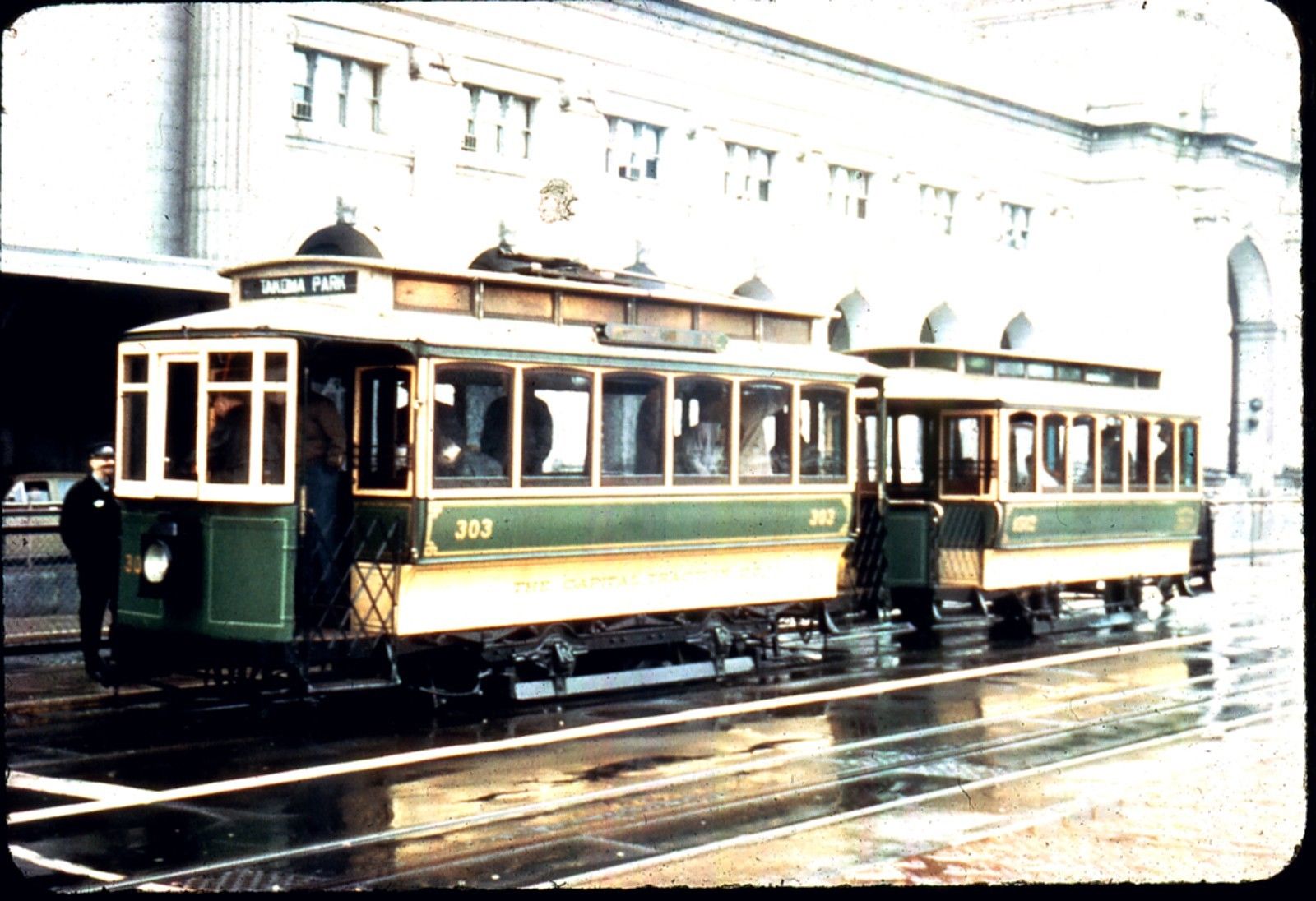 Capital Traction Co # 303-302, ST/DE/DR two car streetcar dup 35mm Color slide