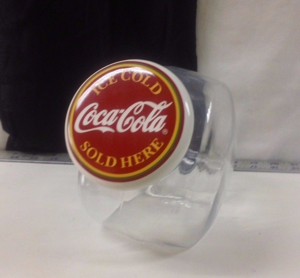 Title (ebay affiliate link): Vtg Coca Cola Clear Glass Cookie Jar Canister Candy w/Lid Ceramic Round Ice Cold