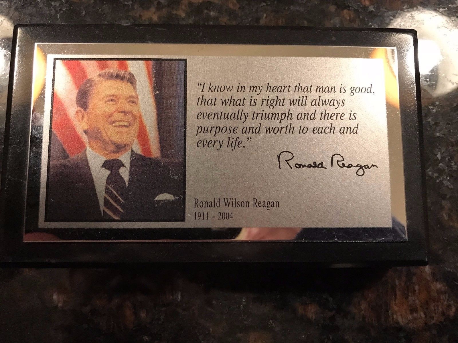 Title (ebay affiliate link): Ronald Reagan Massillon plaque paperweight, stainless steel, photo with quote