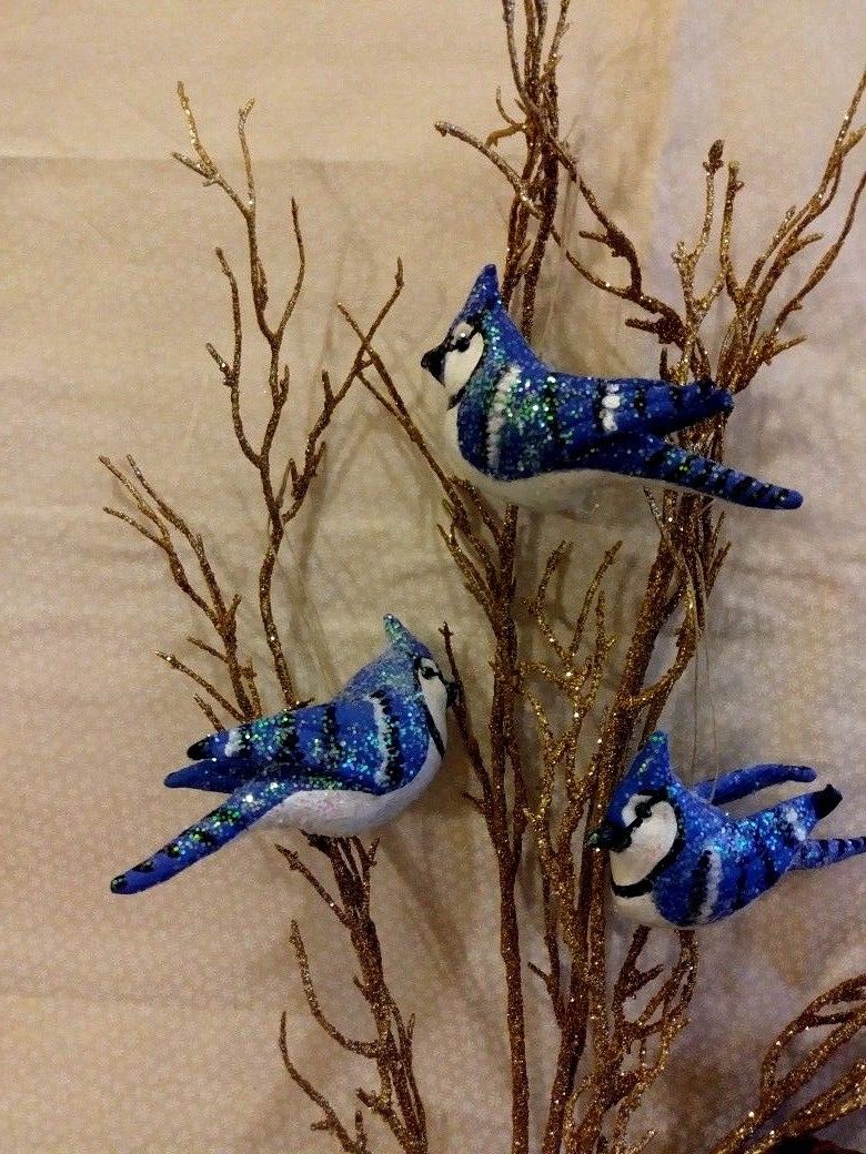 Title (ebay affiliate link): Primitive Birds of Winter Blue Jay set of three frozen glitter bird ornaments!