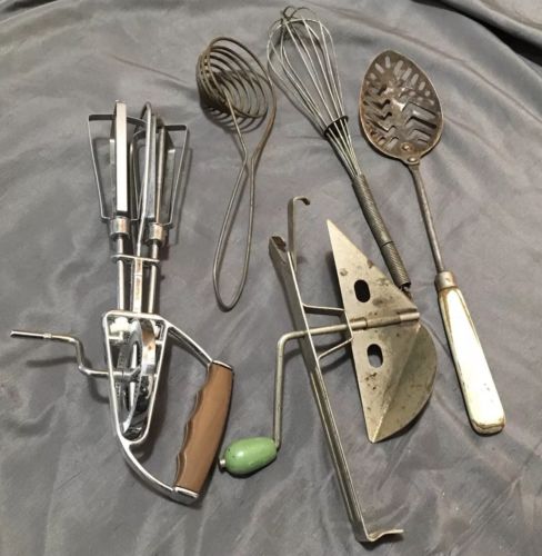 Title (ebay affiliate link): Primitive Kitchen Tools lot wire wood beater mixer blender whisk slotted spoon