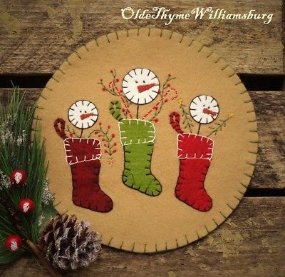 Title (ebay affiliate link): Primitive Stitchery CHRISTMAS Snowman Stockings Penny Rug ~ Winter Candle Mat