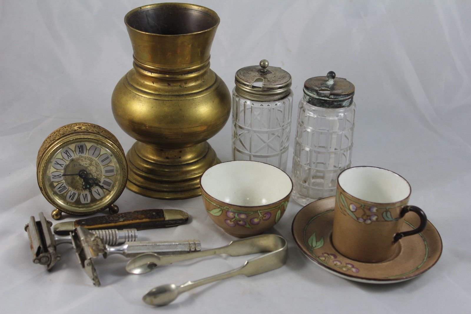 Title (ebay affiliate link): Antique Job Lot, Mixed Collection of Curios, Inc Solid Silver Tongs, Clock etc