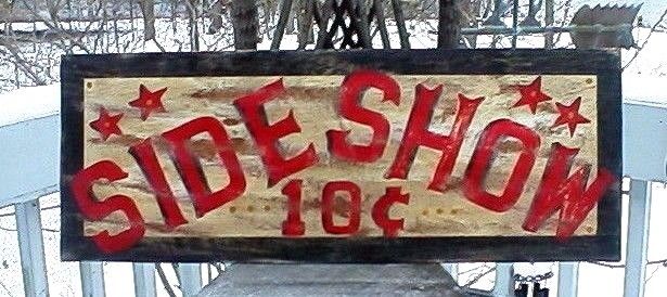 Title (ebay affiliate link): VINTAGE WOODEN CIRCUS OR CARNIVAL SIGN "CARNIVAL " S I D E S H O W 10 CENTS"