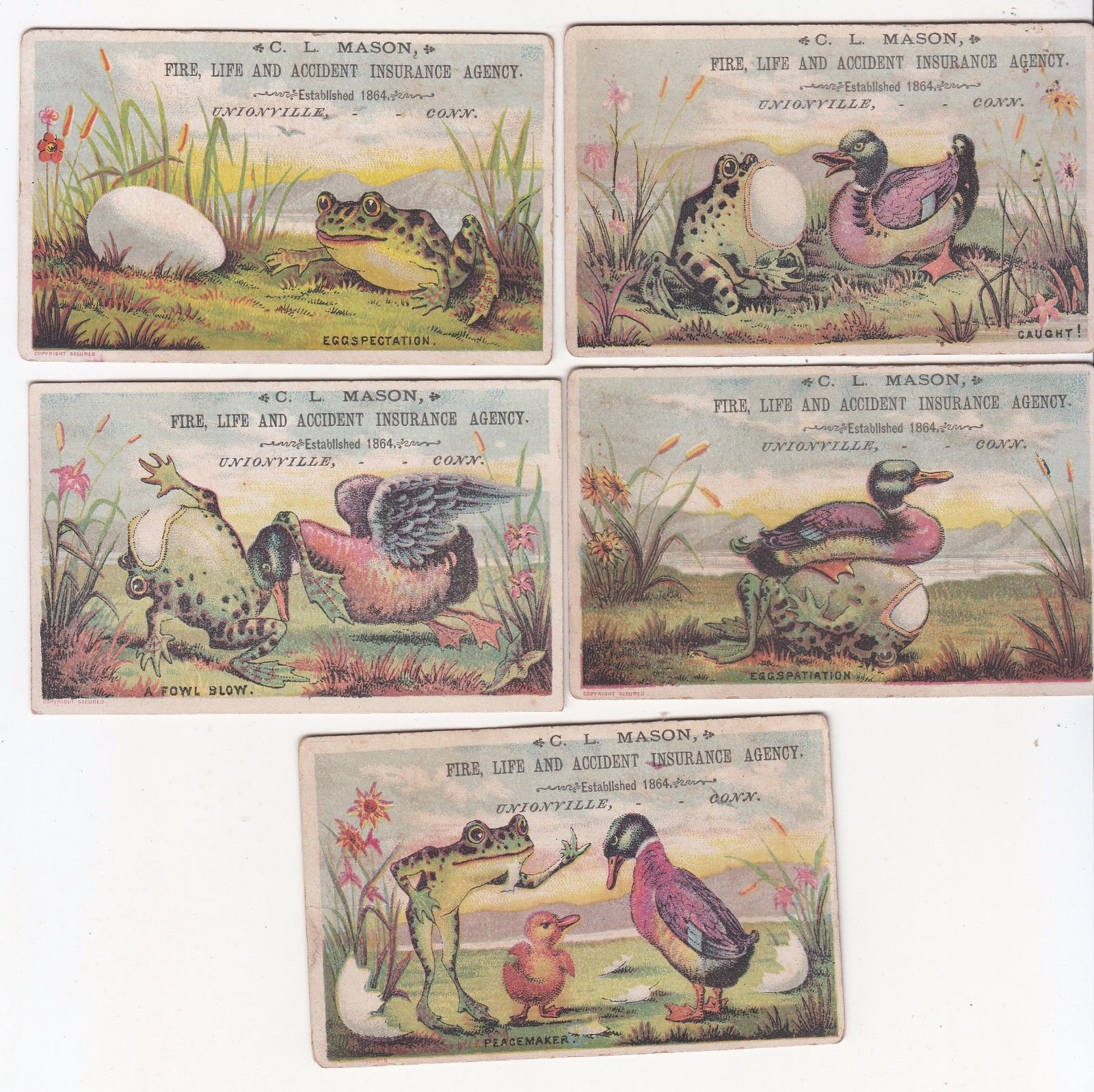 5 C L Mason Fire Life Accident Insurance Unionville CT Frog Egg Duck Card c1880s