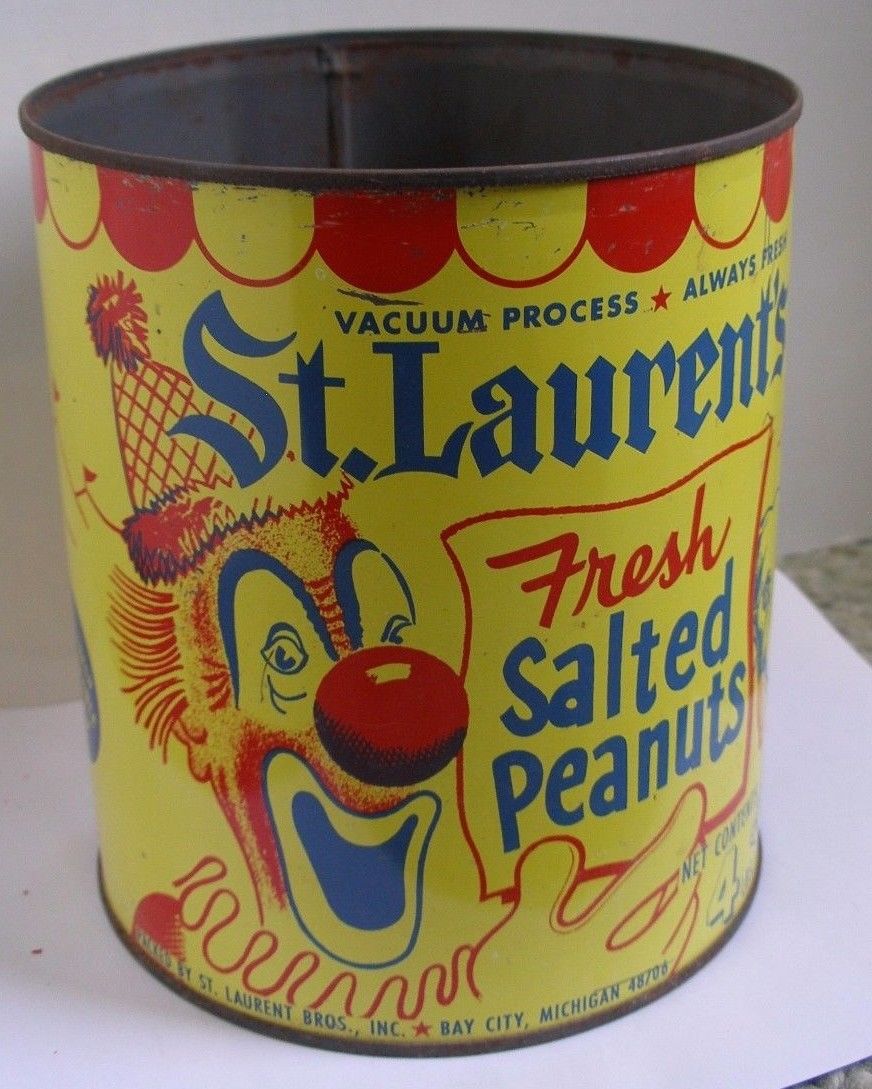 Title (ebay affiliate link): Vintage tin can St Laurents Bros salted peanuts 4 # Bay City, MI circus clown6
