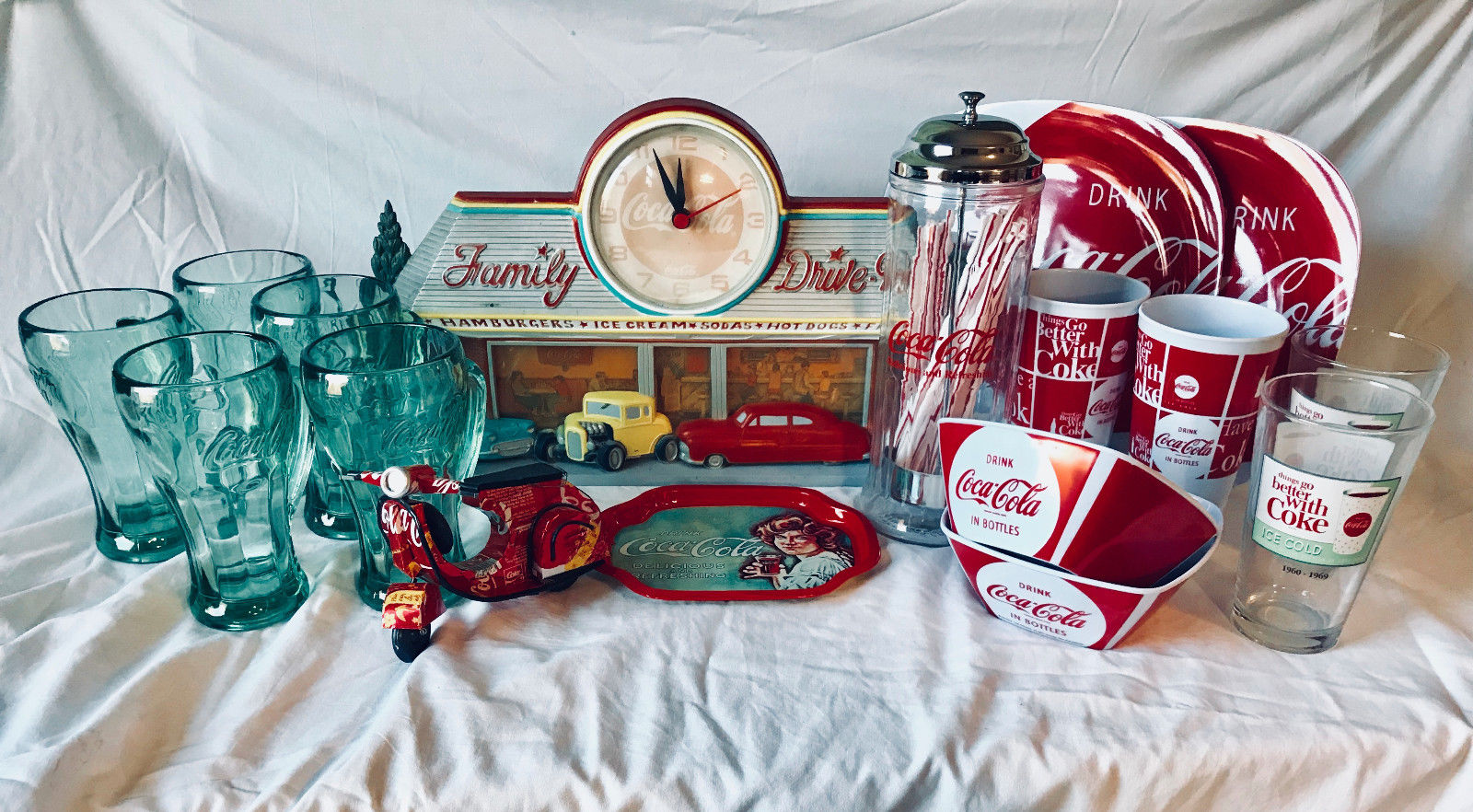 LOT - Coca Cola Collectibles, Clock, Glasses, Straw Holder, Scooter, tray