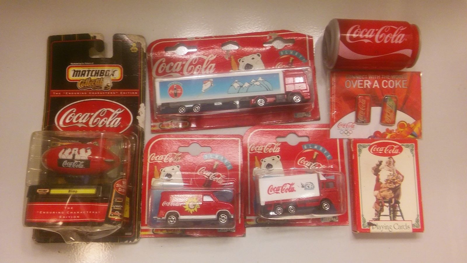 Title (ebay affiliate link): Coke Coca Cola Lot Marchbox blimp 3 majorette trucks chinese can & pins + cards