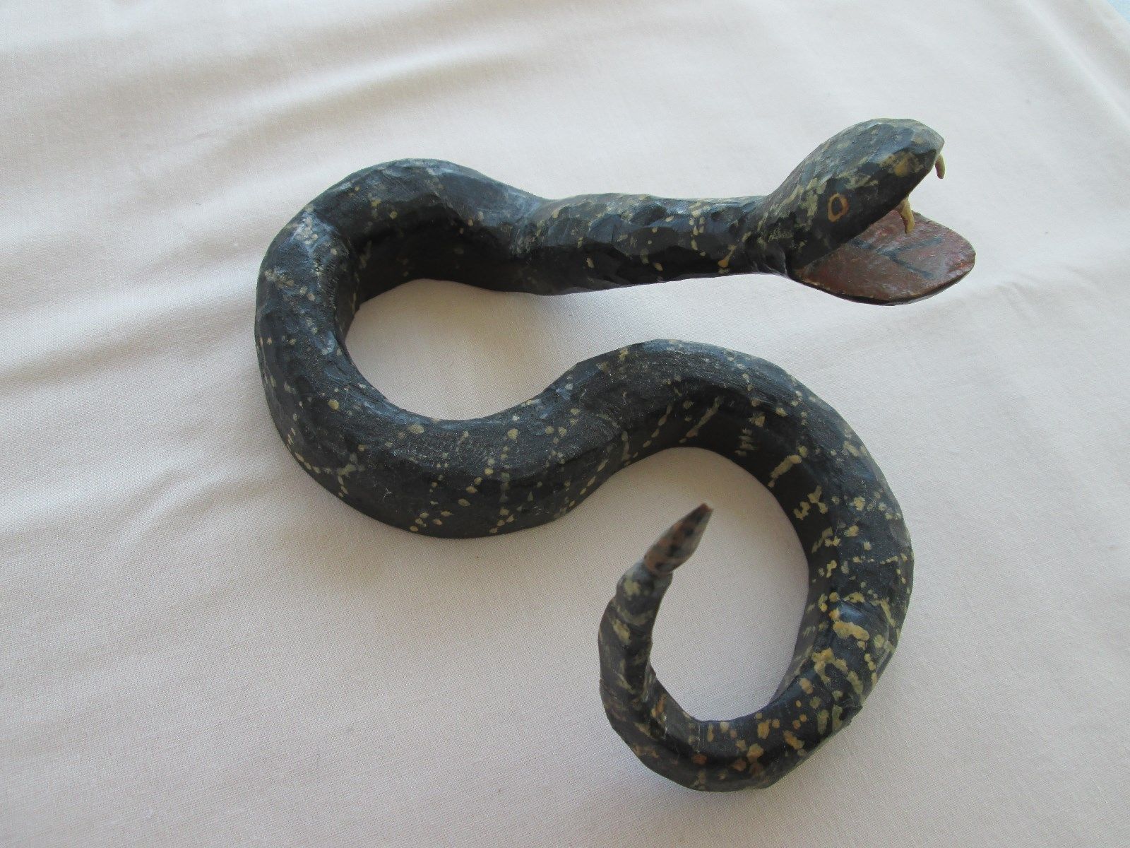 Title (ebay affiliate link): Vintage Folk Art Hand Carved Wooden Snake Ready to Strike Signed Dated