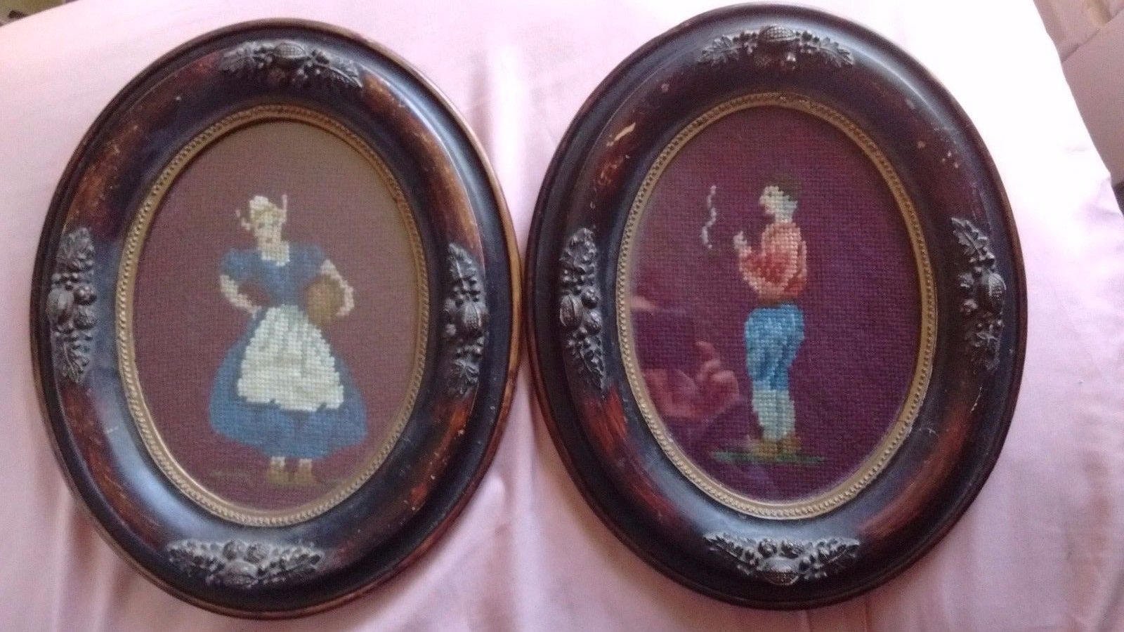 Title (ebay affiliate link): 2 Very Antique OVAL WOOD FRAMES Needle Point Dutch Woman & Man 12x10"