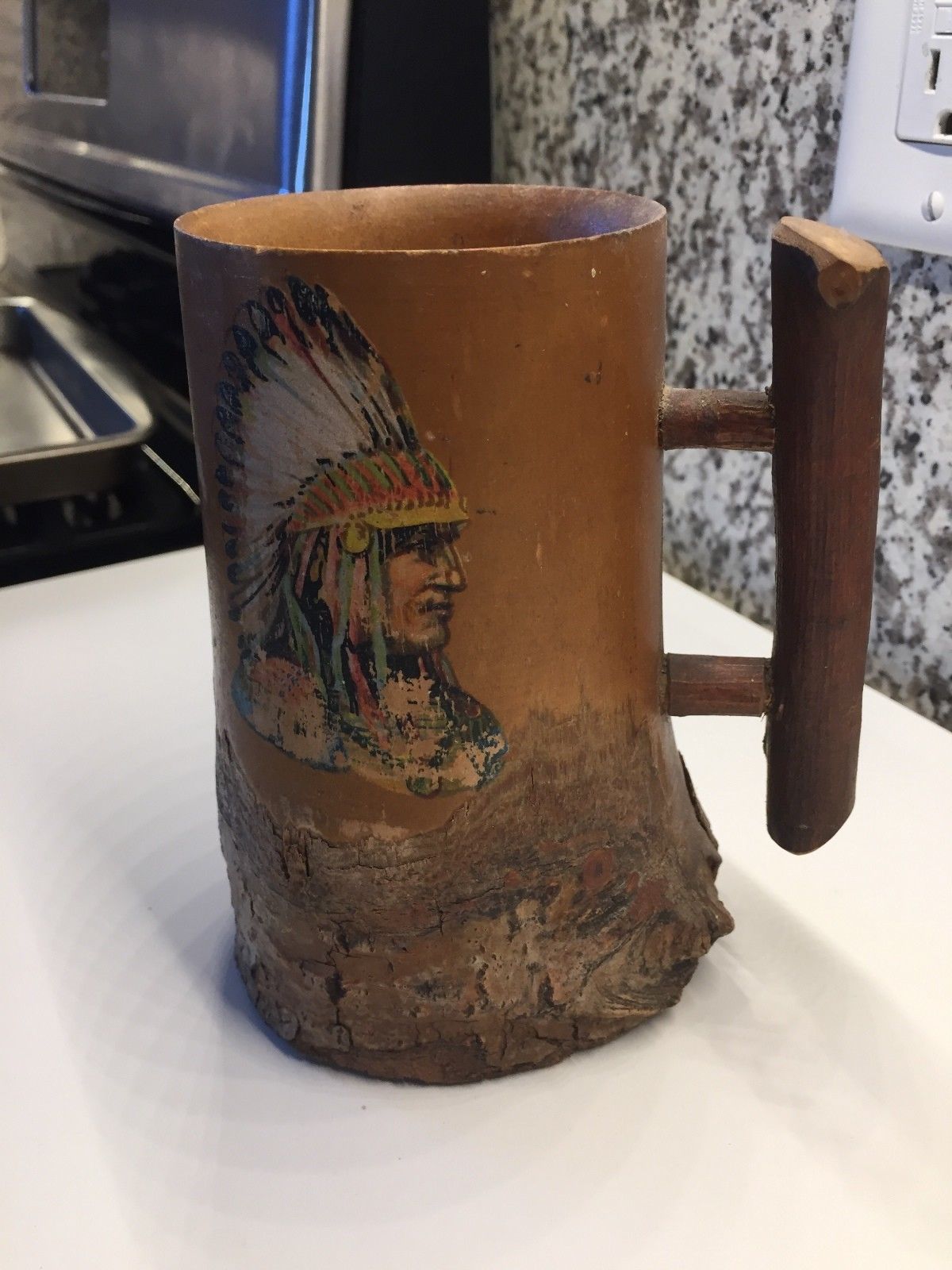 Treenware Wooden Ware Mug. Indian Decal. Alexandria Bay, NY. 1920s