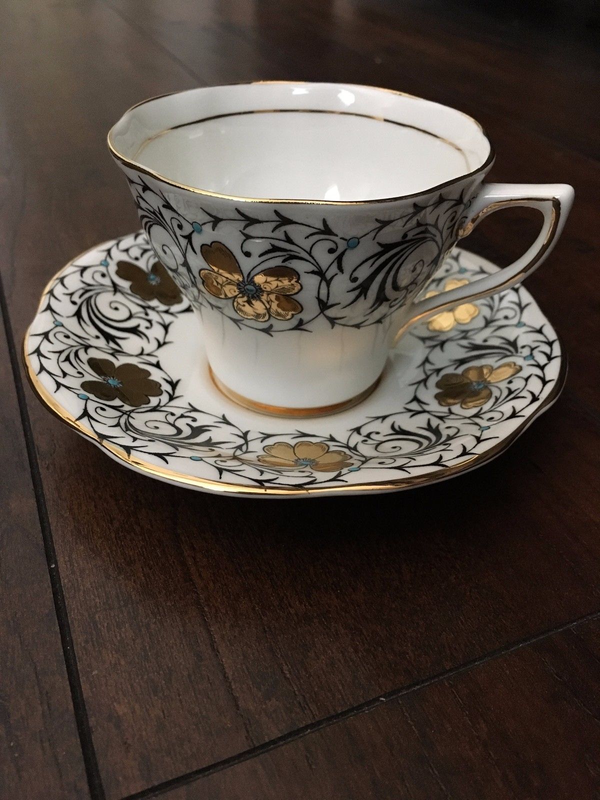 Title (ebay affiliate link): Vintage Royal Kendall Black and White w/ Gold Flowers Tea Cup and Saucer England