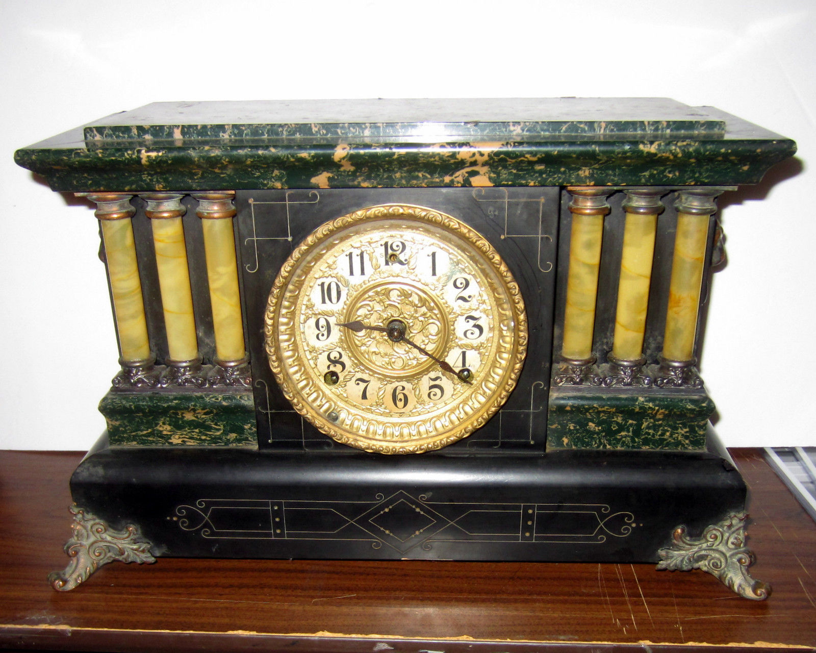 Title (ebay affiliate link): Beautiful large antique mantel clock, made to look like marble, but it''s not