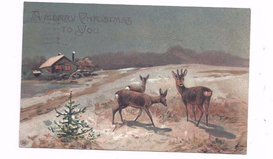 Title (ebay affiliate link): Antique 1909 Christmas Post Card Country House Night Deer in a Field