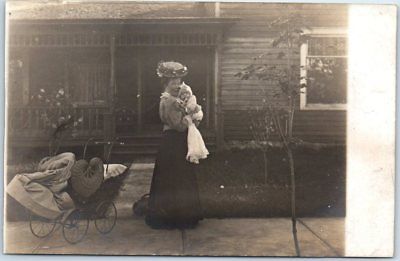 Title (ebay affiliate link): Michigan RPPC Photo Postcard Woman & Baby w/ Carriage & House 1907 ONAWAY Cancel