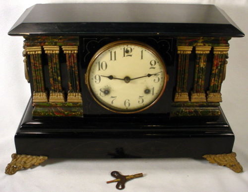 Title (ebay affiliate link): Antique Early 1900s Black Waterbury Mantle Clock with Key Pendulum 6 Pillar