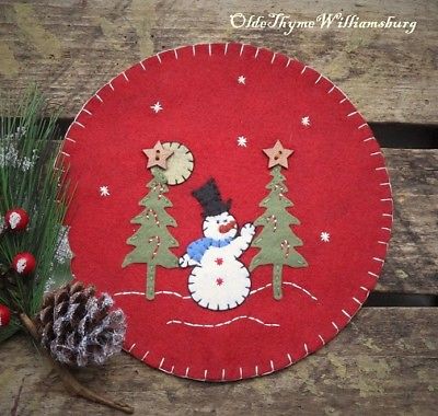Title (ebay affiliate link): Primitive Stitchery CHRISTMAS Snowman & Fir Trees Penny Rug ~ Winter Candle Mat