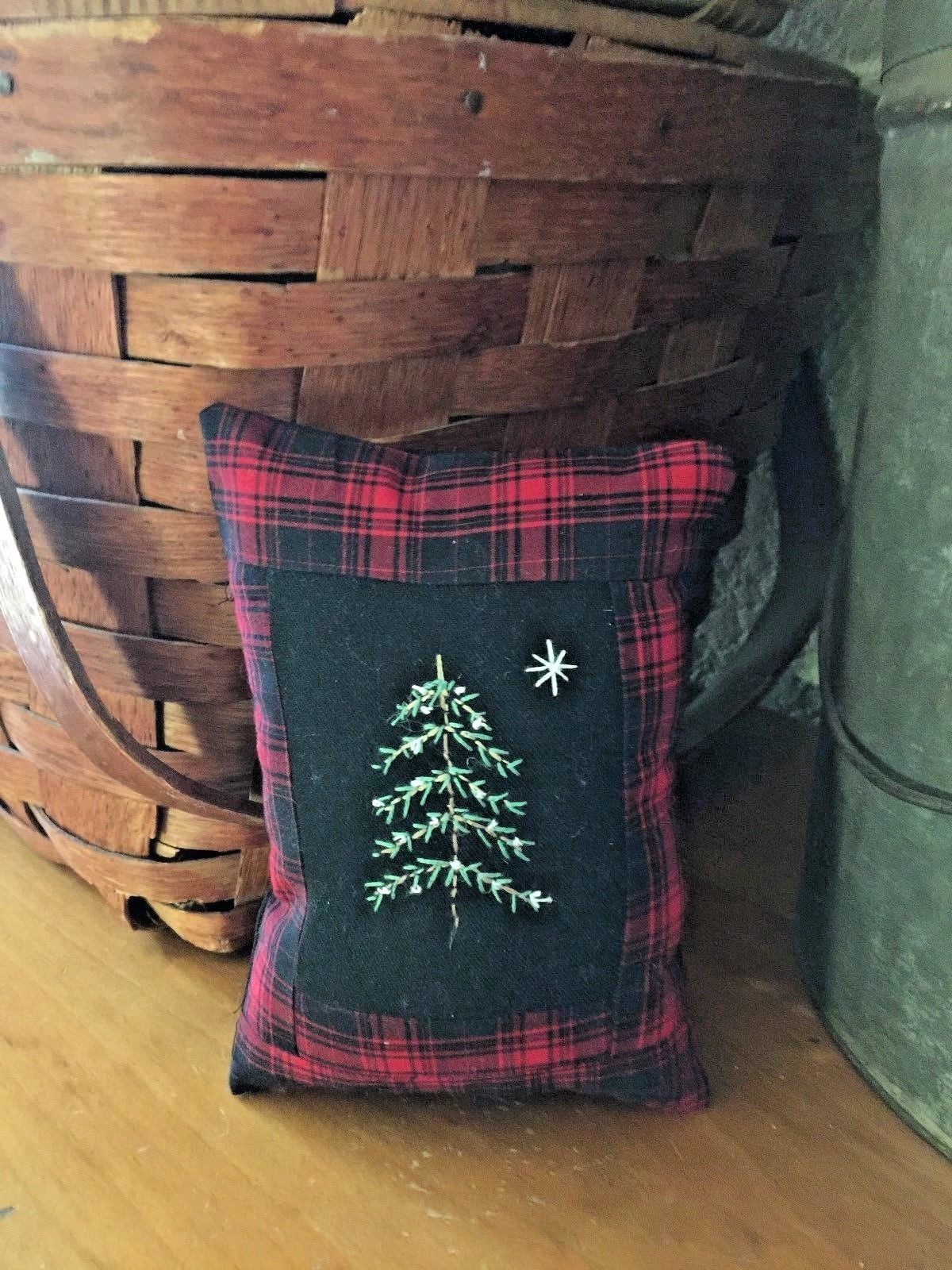 Title (ebay affiliate link): Primitive Stitchery Christmas Evergreen Ornie Folk Art Red and Black Plaid