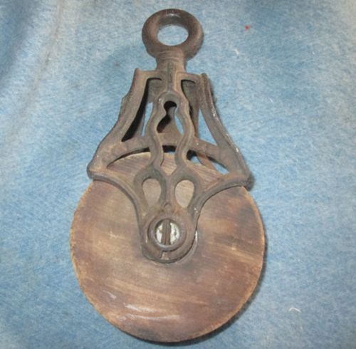 Title (ebay affiliate link): Antique Cast Iron & Wood Farm Pulley Muller & Bro.