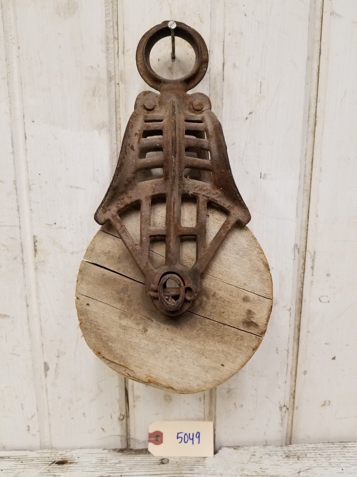 Title (ebay affiliate link): Antique Cast Iron & Wood Barn Pulley ~ Vintage Primitive Farm Tool Myers Louden?