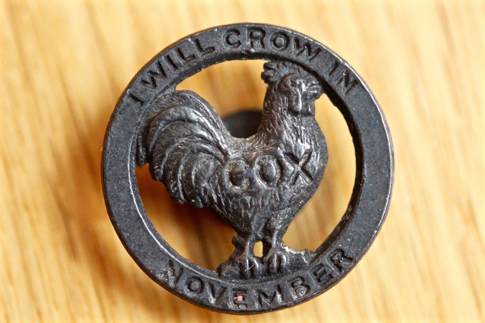 1920 Cox Presidential Campaign Lapel Collar Stud Button. "I Will Crow." Metal