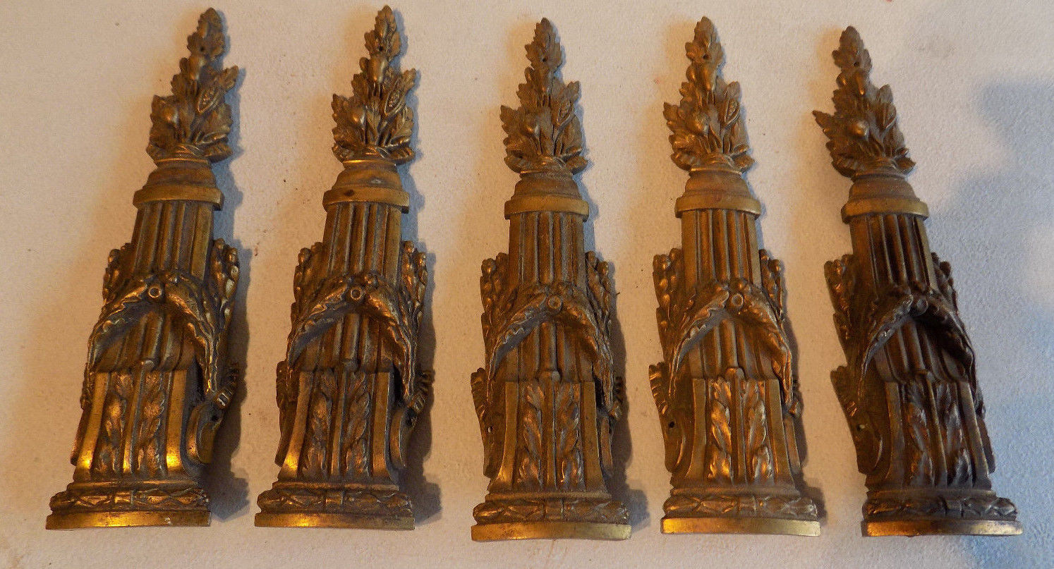 RARE VINTAGE LOT 5 FURNITURE LEG BRASS PLAQUES BOUQUET OF FLOWERS 7" LONG *NR*