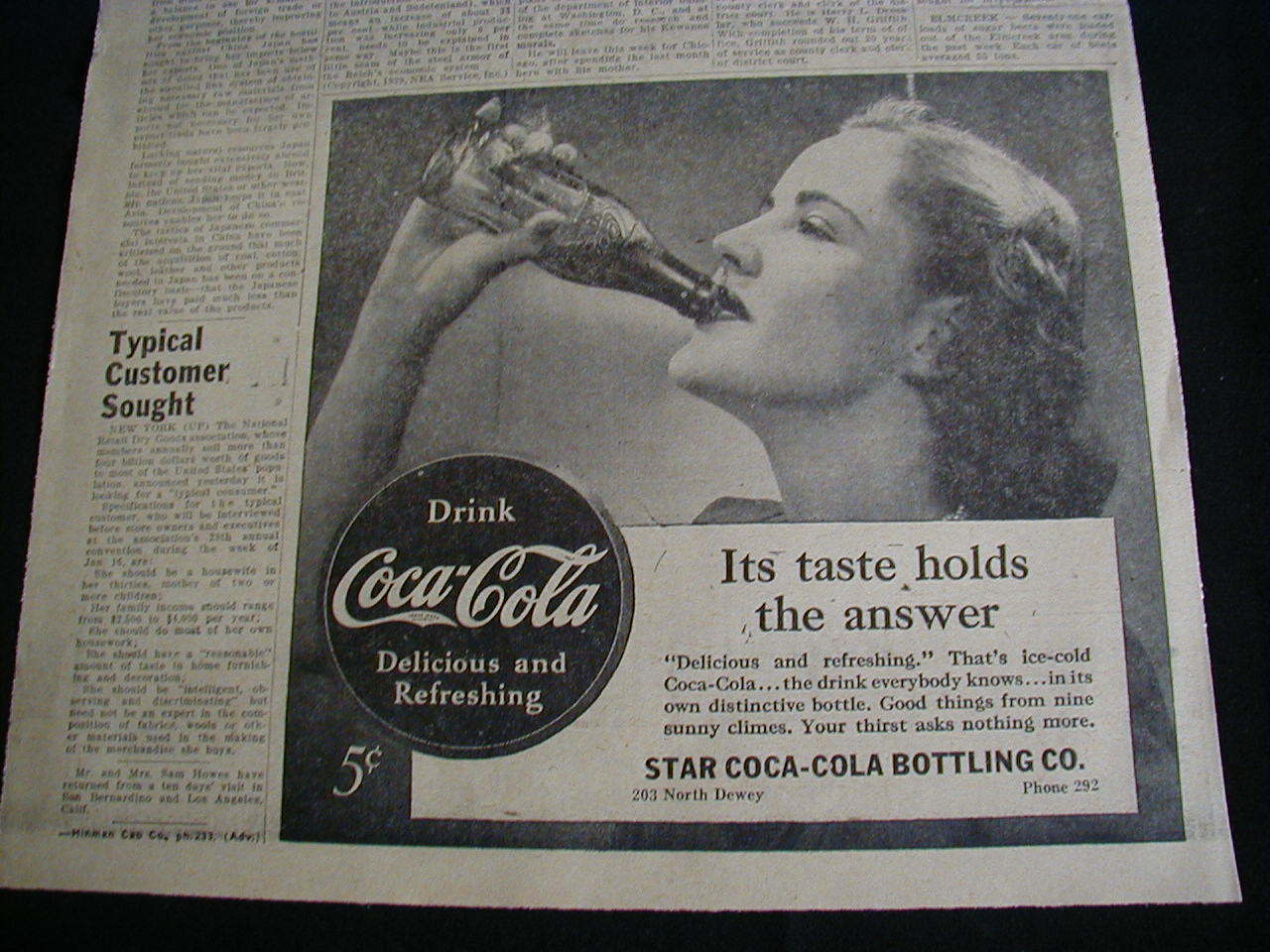 vintage 1939 newspaper ad coca cola star bottling nebraska Nice & clean