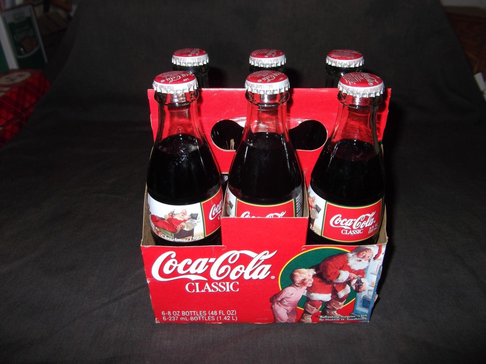 Title (ebay affiliate link): Coca Cola 6 Pack 8 oz. Bottles Christmas 1995 Holiday Coke Sundblom Santa Claus