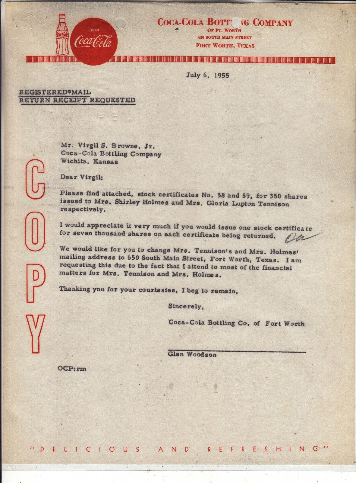 COCA-COLA BOTTLING COMPANY OF FORT WORTH LETTERHEAD DATED JULY 6, 1955